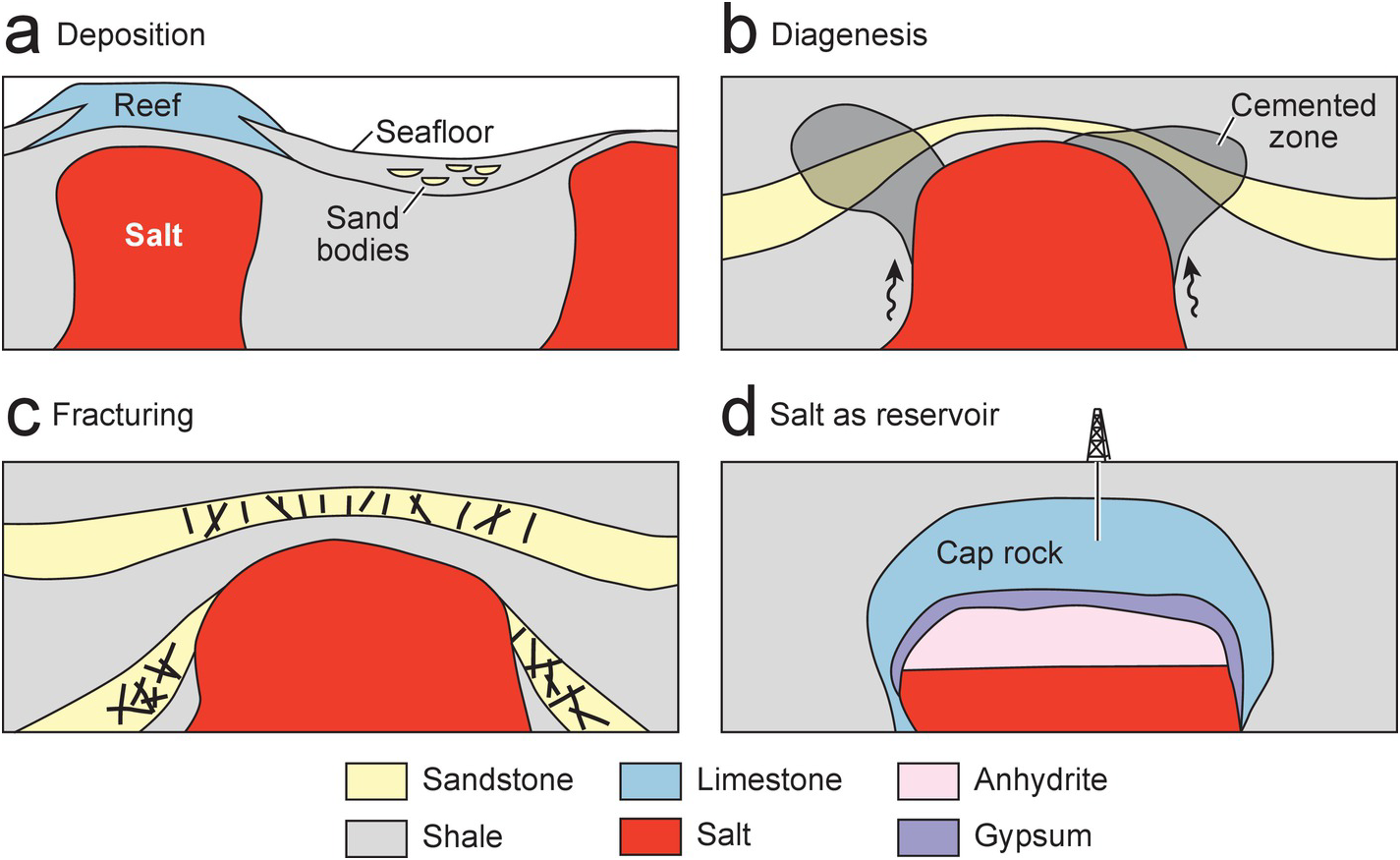 به دلیل حرکت رو به بالا و ماهیت غیرقابل نفوذ خود نمک ُ این توده ها به صورت دام عمل می کنند و به طور موثر به عنوان یک پوشش تله نفت/گاز عمل می کنند تا از مهاجرت بیشتر نفت و گاز پس از رسیدن به تله جلوگیری کنند. .این امر بهویژه در منطقه خلیج فارس به دلیل لایههای ضخیم رسوبات نمک در سازندهای زمینشناختی رایج است، چرا که تحت فشار و نیروهای زمین ساختی، به آسانی گنبدهای نمکی دیاپیرها شکل میگیرند.
